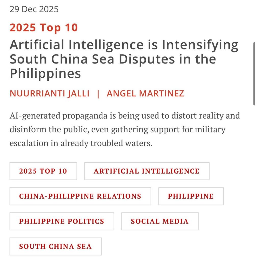 [Peer reviewed], Jalli, N. & Martinez, A. (2025). “Artificial Intelligence is Intensifying South China Sea Disputes in the Philippines” Fulcrum: Analysis on Southeast Asia. ISEAS Yusof Ishak Institute. https://fulcrum.sg/artificial-intelligence-is-intensifying-south-china-sea-disputes-in-the-philippines/