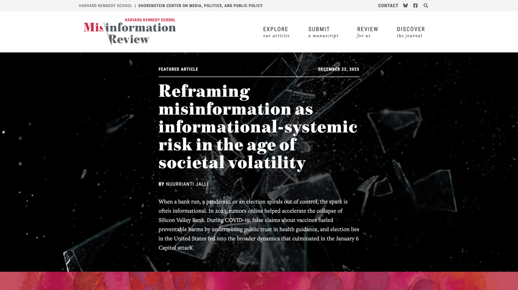 Jalli, N. (2025). Reframing misinformation as informational-systemic risk in the age of societal volatility. Harvard Kennedy School (HKS) Misinformation Review, 6(6).